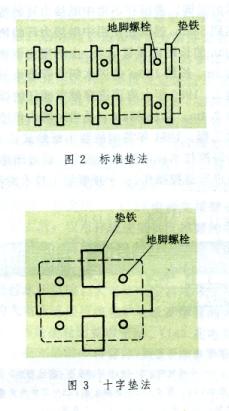 墊鐵一般應(yīng)在靠近地腳螺栓的兩側(cè)安放,稱標(biāo)準(zhǔn)墊法(圖2)。根據(jù)設(shè)備底座的大小、構(gòu)造型式和地腳螺栓間距的不同,還有不同的墊法。例如:當(dāng)設(shè)備底座小i地腳螺栓間距較近時,可采用在兩根地腳螺栓之間只安放一組墊鐵的十字墊法(圖3);當(dāng)?shù)啬_螺栓間距較遠(yuǎn)時,除采用標(biāo)準(zhǔn)墊法外,還需采用在中間增加一組墊鐵的輔助墊法;對大型設(shè)備可根據(jù)底座形狀和地腳螺栓間距的大小,采用包括標(biāo)準(zhǔn)墊法、十字墊法和輔助墊法的混合墊法。