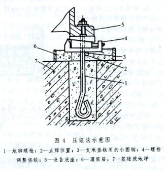 壓漿法 利用螺栓調(diào)整墊鐵壓緊灌漿層并對設(shè)備安裝進(jìn)行精調(diào)整,使墊鐵與設(shè)備底座及灌漿層緊密接觸的施工方法。其作法是:在地腳螺栓的適當(dāng)位置上焊一根小圓鋼作為螺栓調(diào)整墊鐵的支承,當(dāng)設(shè)備用臨時墊鐵安裝初步找平后進(jìn)行二次灌漿,同時在設(shè)備底座與小圓鋼中間裝入調(diào)整墊鐵,在灌漿層達(dá)到初凝后調(diào)整墊鐵的升降塊壓緊設(shè)備底座底面和灌漿層,當(dāng)灌漿層達(dá)到規(guī)定強(qiáng)度的75%以后拆除臨時墊鐵,再用螺栓調(diào)整墊鐵精調(diào)設(shè)備的水平度和標(biāo)高(圖4)。